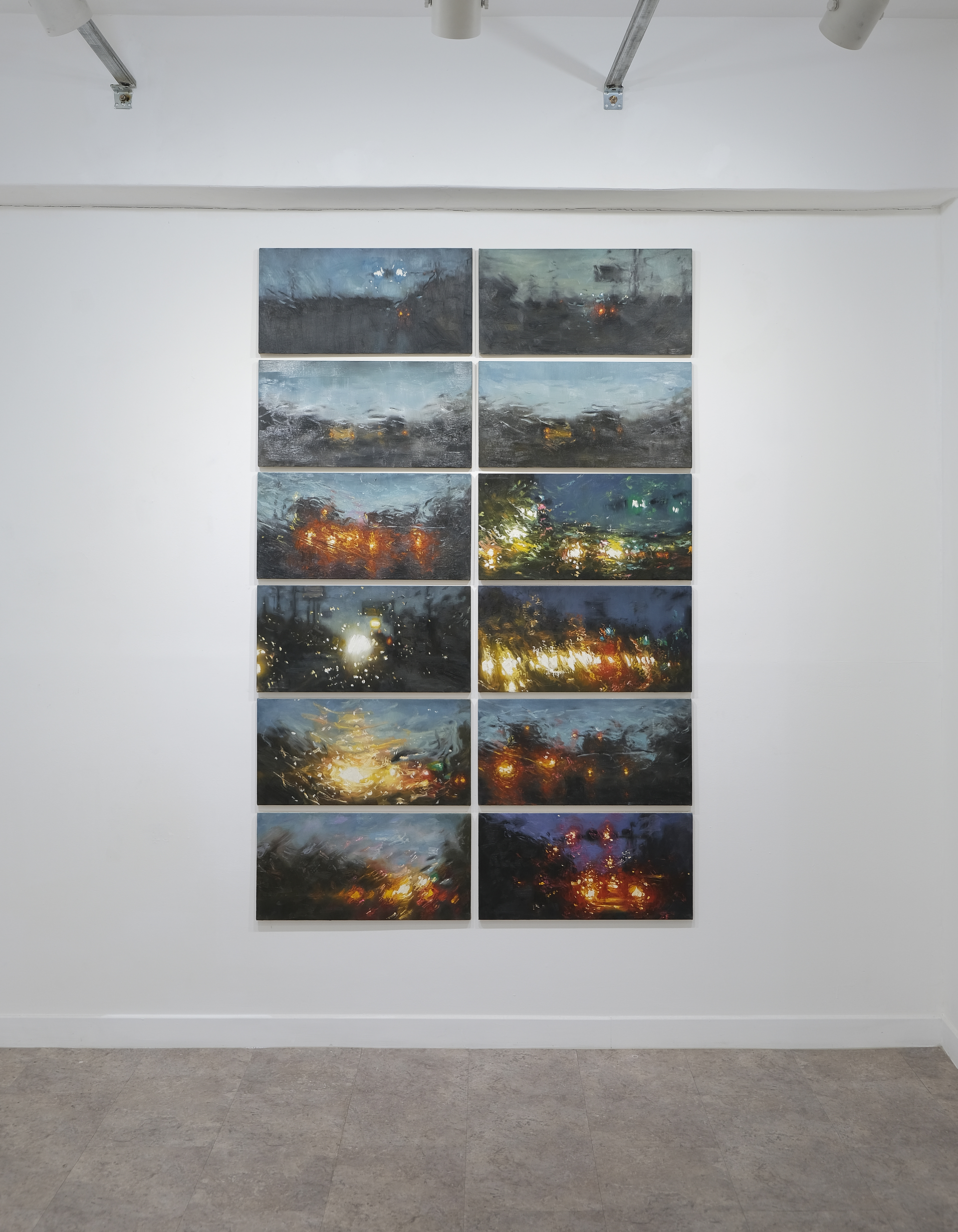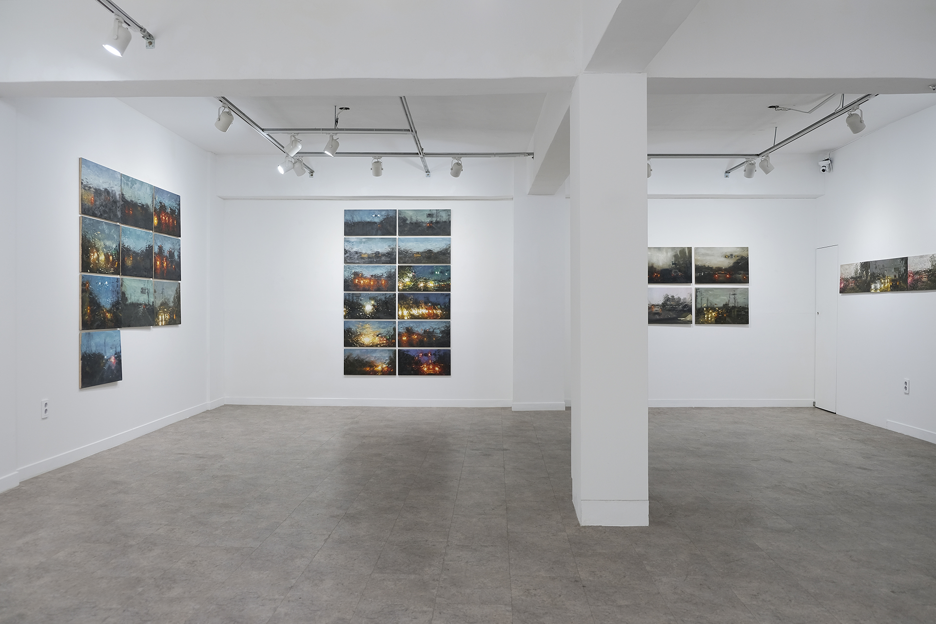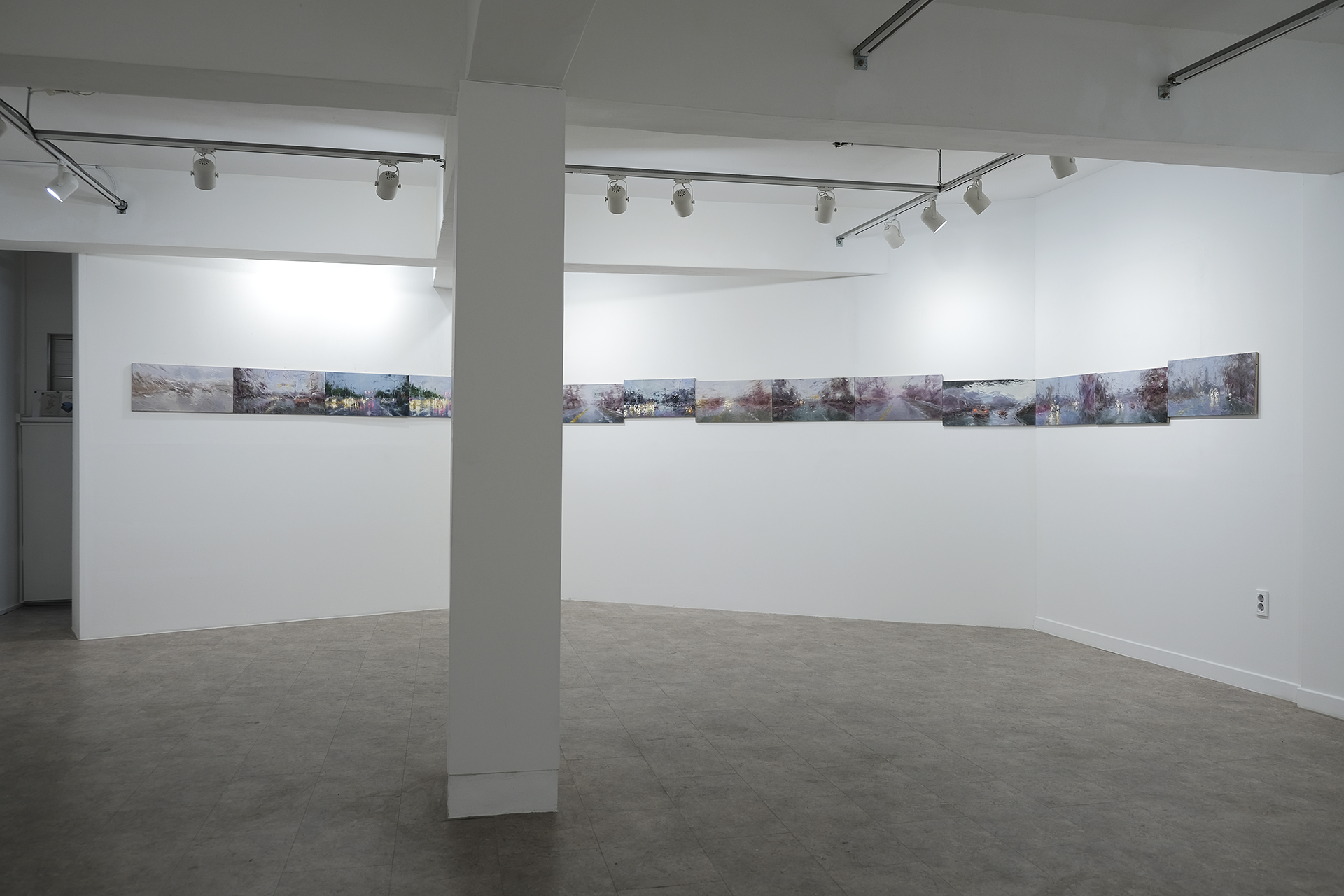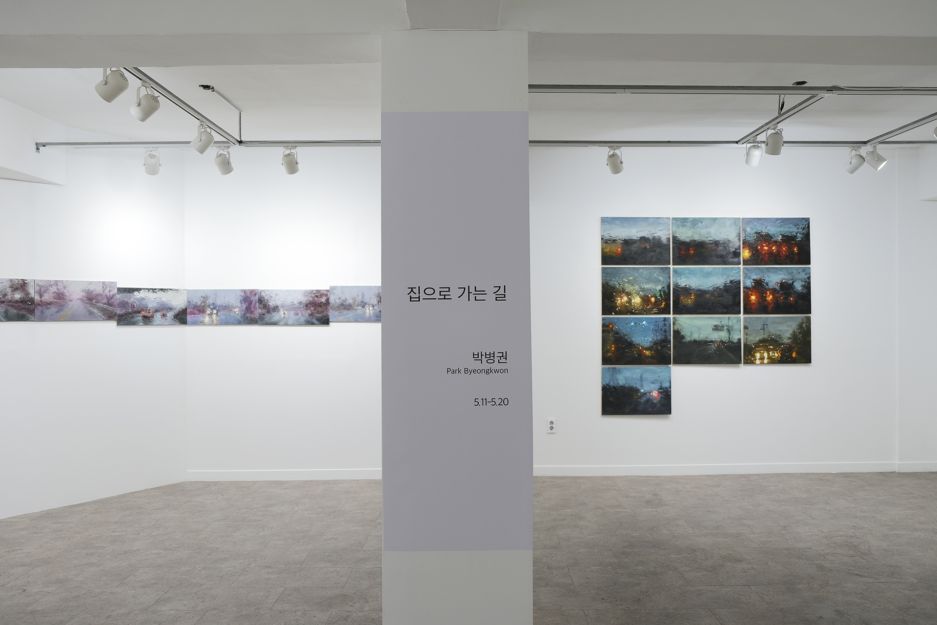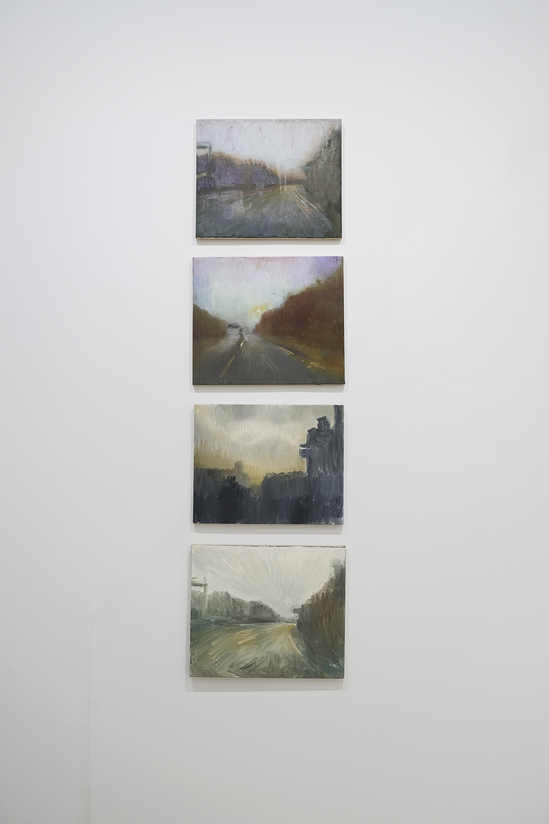 이번 전시에서 선보이는 후자의 작업들 – ‘집으로 가는 길’ 연작은 운전 중 캡처한 사진을 바탕으로 그렸다. 하루 일을 마치고 집으로 돌아가며 작가는 운전석이라는 제한된 공간에서 차창을 매개로 안과 밖이 분리된 세계를 감각한다. 빗물에 뒤섞인 듯 빠르게 흐르는 색과 산란되는 빛 그리고 일그러진 형태들은 작은 캔버스 안에서 허락된 짧은 시간만에 완성되었다. 삶을 지탱하는 고된 노동으로부터 돌아와 앉은 방 한구석에서 어쩌면 작가는 자신에게 남은, 그리고 아직 다 내려놓지 못한 몇몇 조각에 대한 답을 찾으려 부단히 애를 썼는지 모른다. ‘집으로 가는 길’이 작가에게, 오랜만에 자신의 깊숙한 곳으로 침잠할 수 있는, 그래봐도 괜찮은 방법이 되길 바란다.