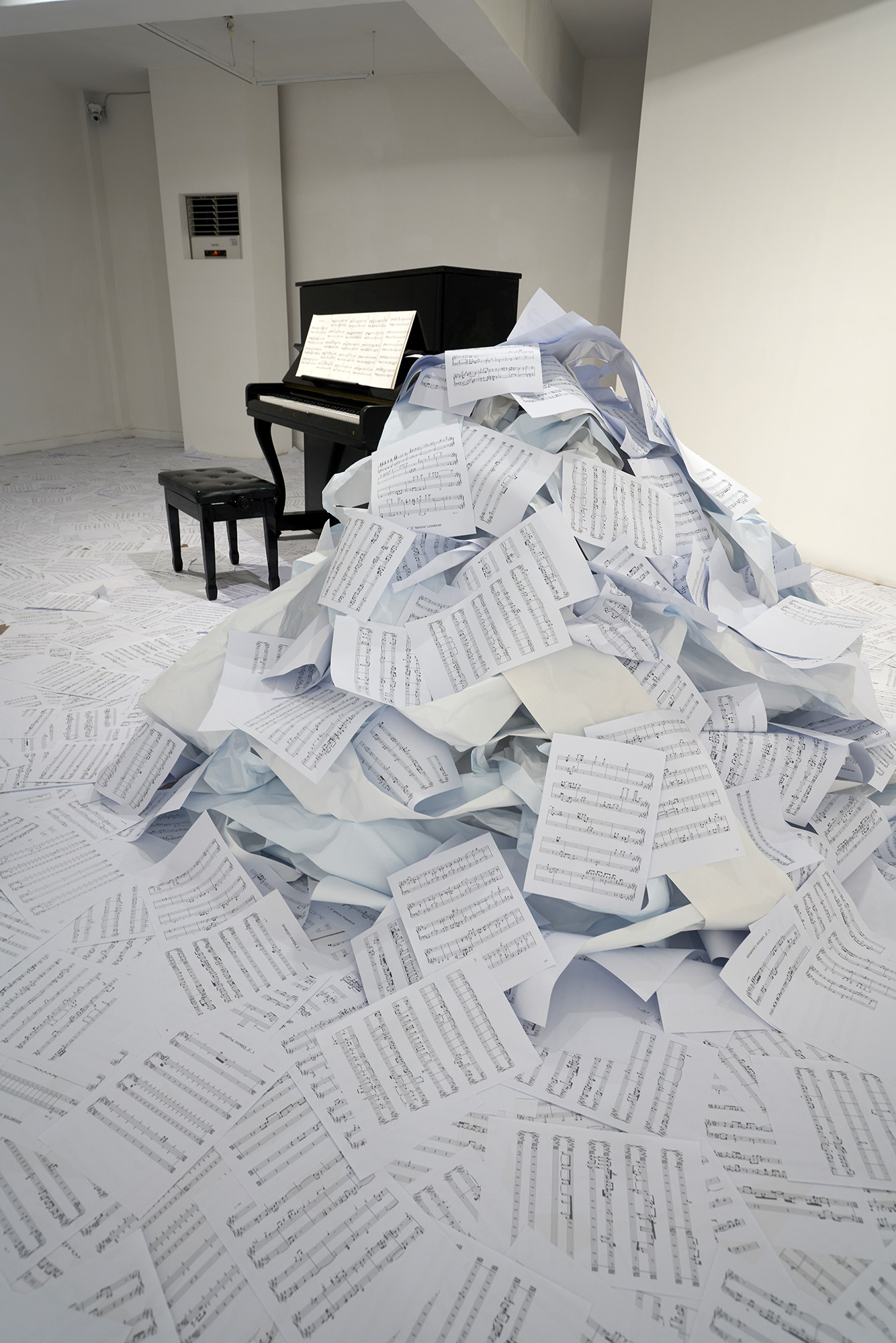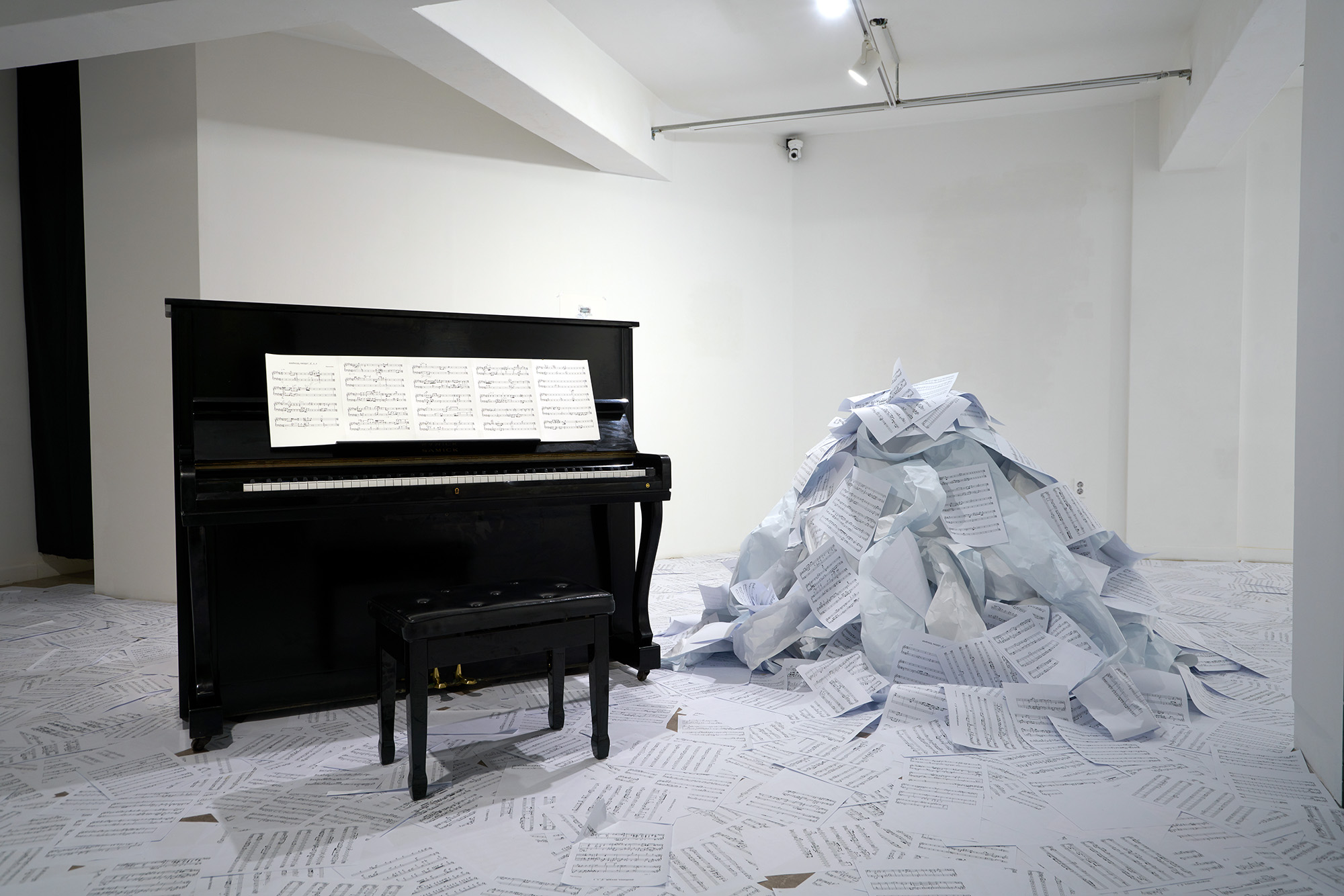 피아노 연주가 시작되는 순간 잔존 현상이 나타나기 시작한다. 사운드들이 서로 주장하며 전시장 안의 사운드와 피아노 연주가 섞여 반대되는 과정이 일어날 때, 그리고 그것을 보는 관객이 있을 때 작업이 말하고자 하는 것은 분명해진다.