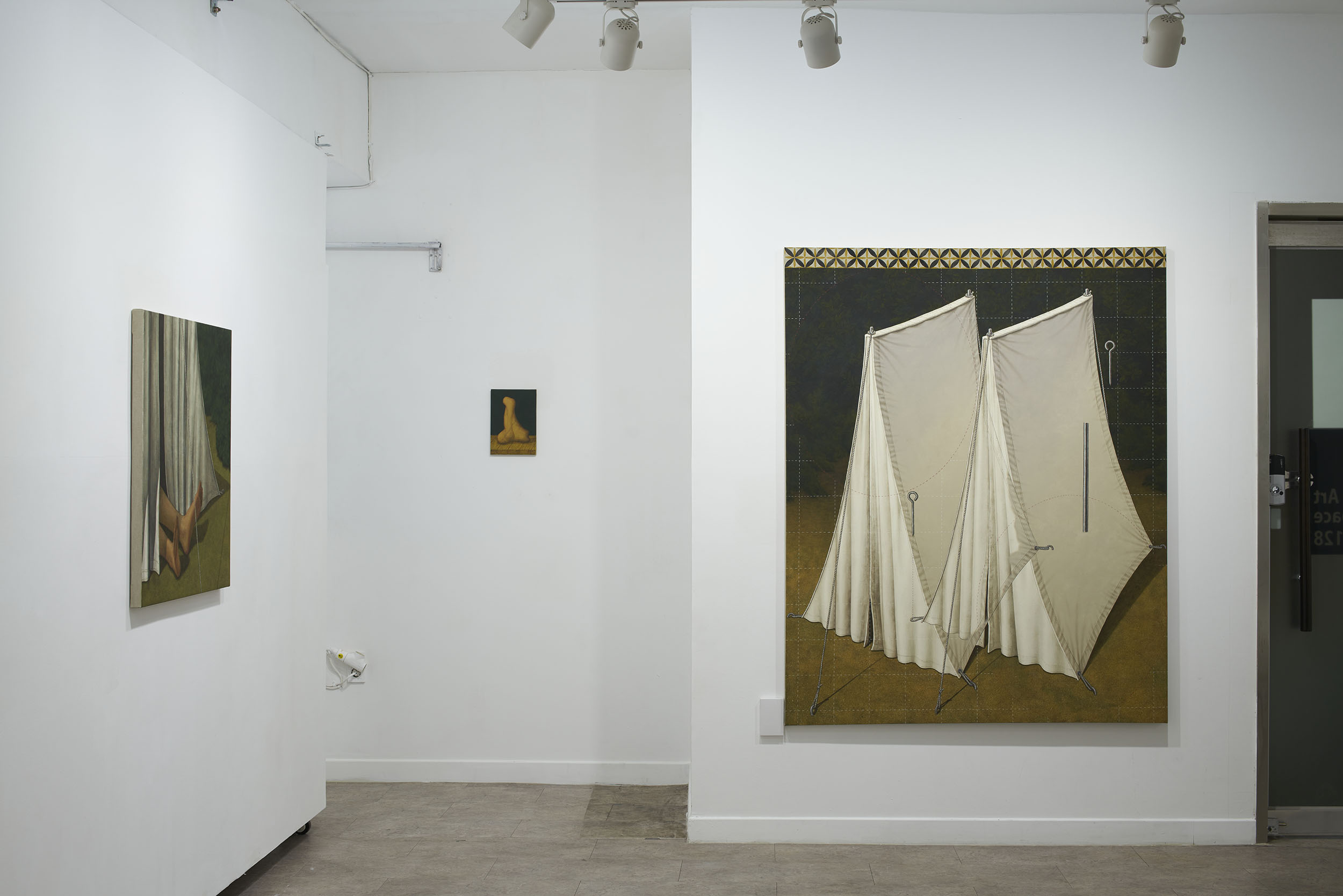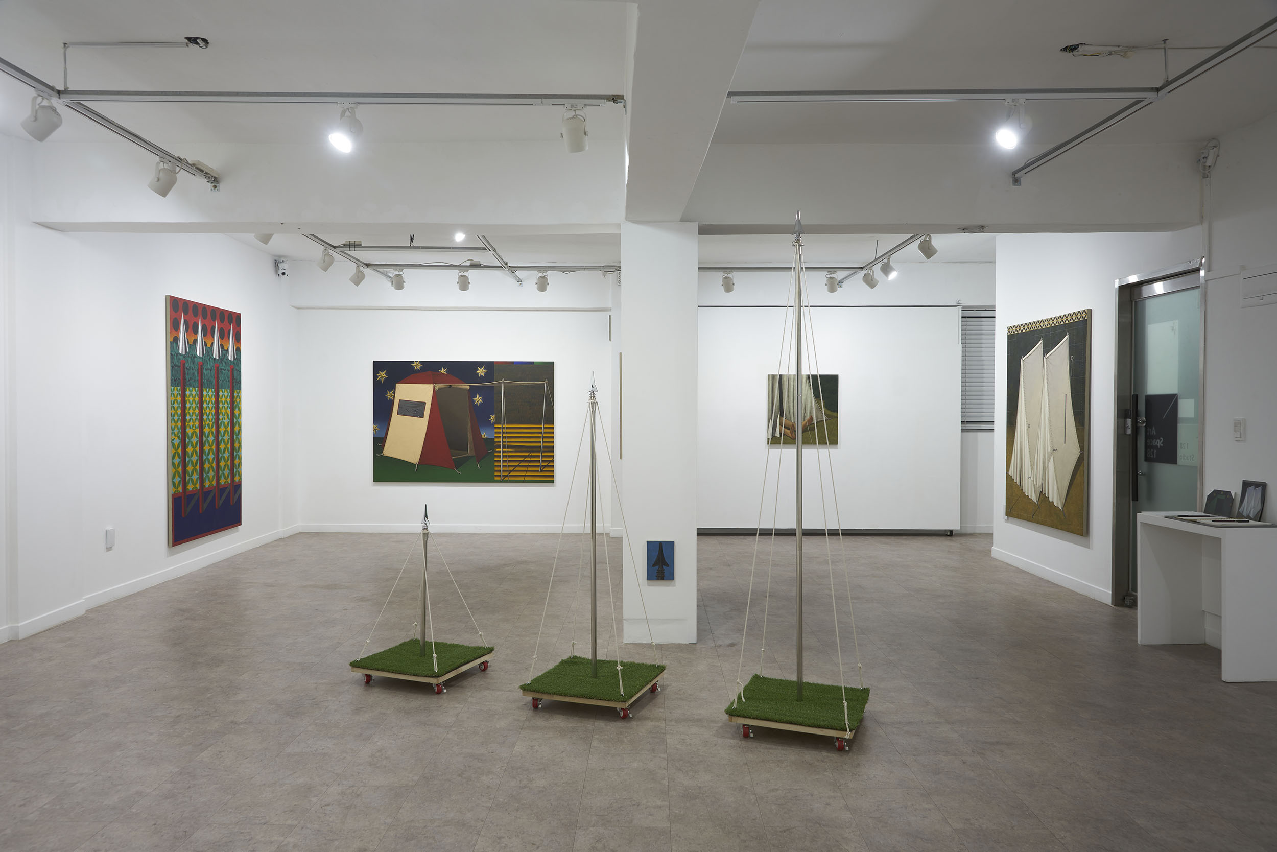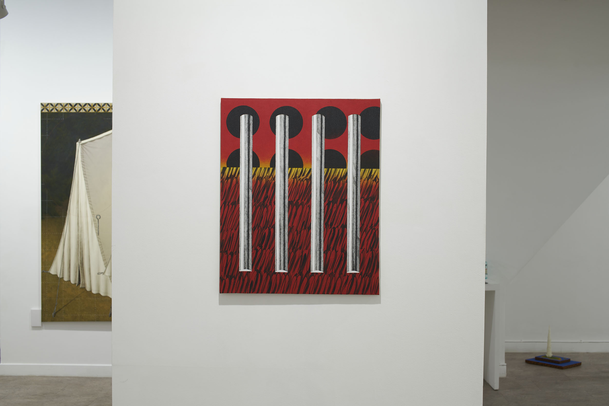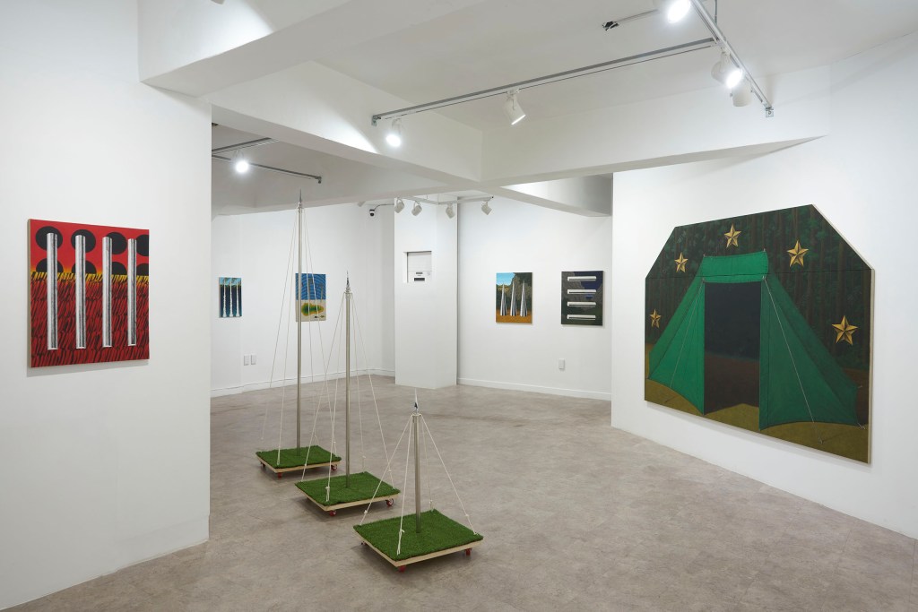 이번 전시는 ‘안’과 ‘밖’의 의미를 내포한 이미지들로 이루어진 작품들을 위주로 구성했다. 안쪽에서부터 바깥쪽으로 폭발해 나가는 포연(砲煙)과 분수(噴水)처럼 보이는 이미지. 그리고 안과 밖, 자연과 인간의 매개체로서 표현된 텐트의 형상이 그러하다. 텐트를 중심으로 화면을 부유하는 점선과 별, 워터마크처럼 보이는 글씨들은 가상과 현실을 은유한다.
