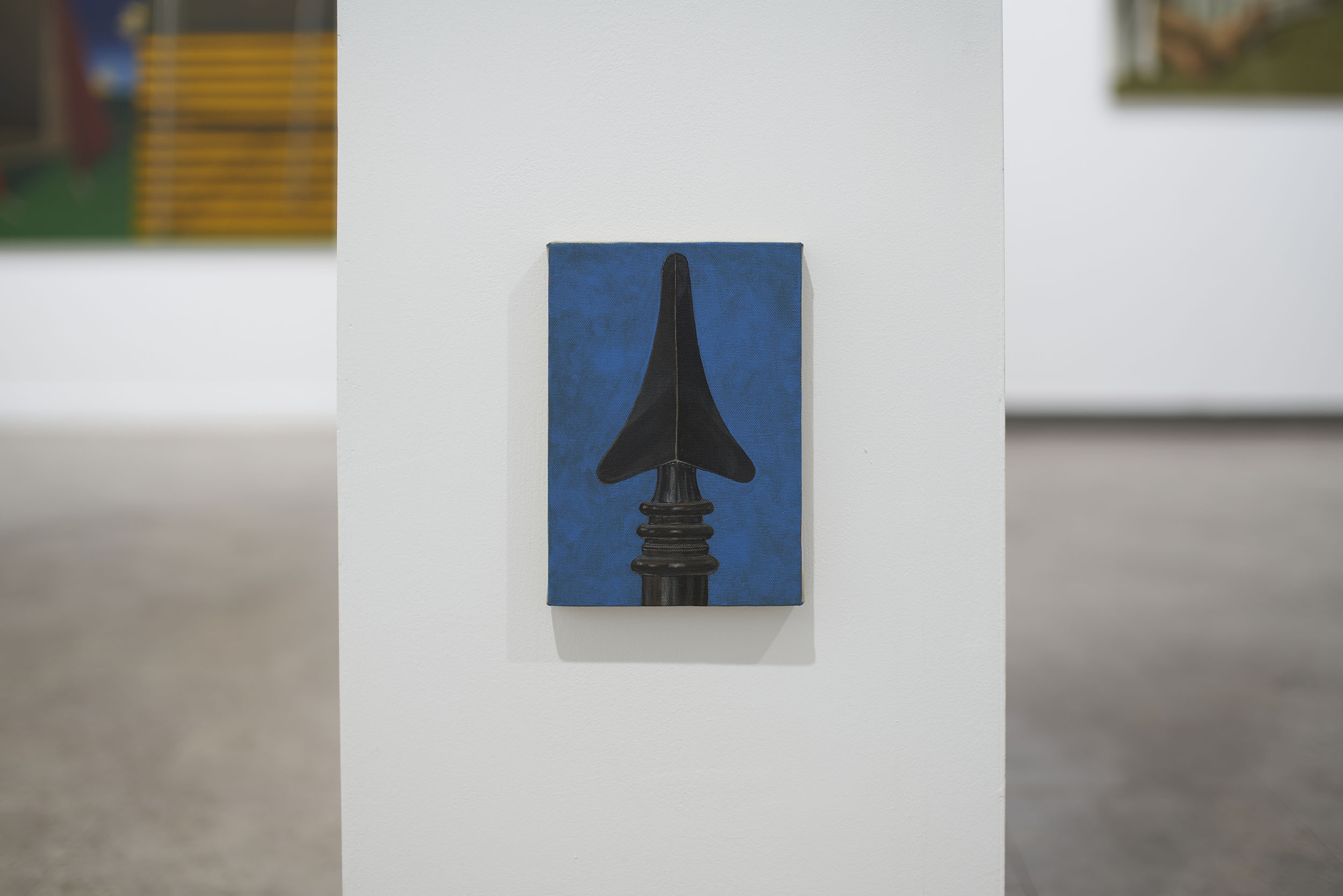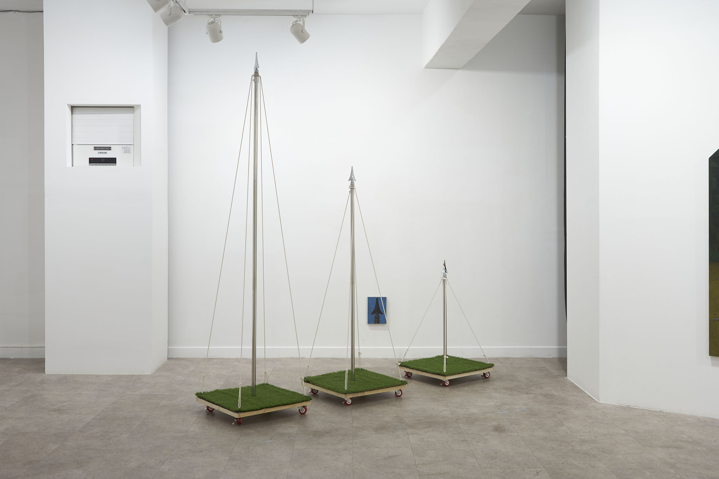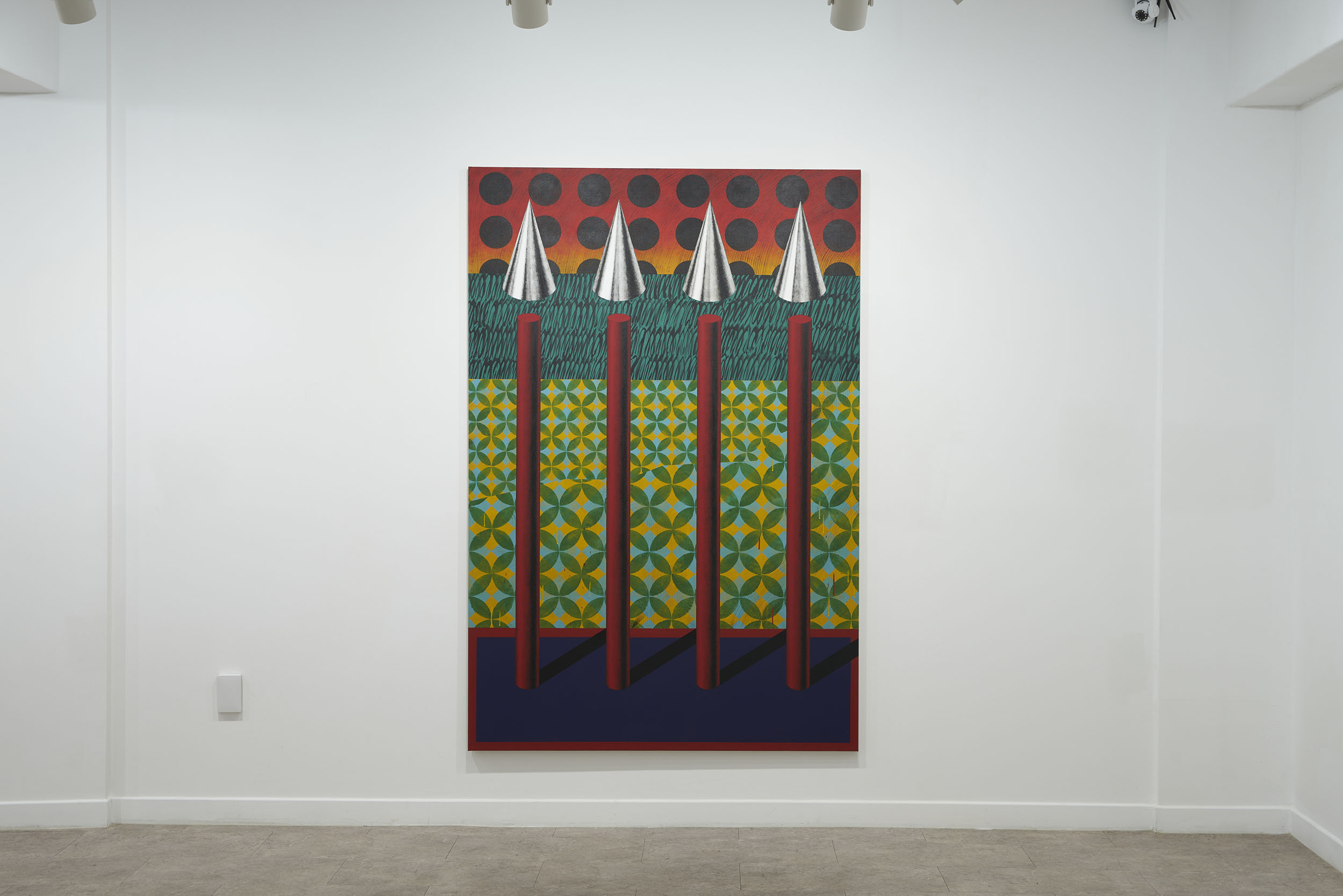 이번 전시는 ‘안’과 ‘밖’의 의미를 내포한 이미지들로 이루어진 작품들을 위주로 구성했다. 안쪽에서부터 바깥쪽으로 폭발해 나가는 포연(砲煙)과 분수(噴水)처럼 보이는 이미지. 그리고 안과 밖, 자연과 인간의 매개체로서 표현된 텐트의 형상이 그러하다. 텐트를 중심으로 화면을 부유하는 점선과 별, 워터마크처럼 보이는 글씨들은 가상과 현실을 은유한다.