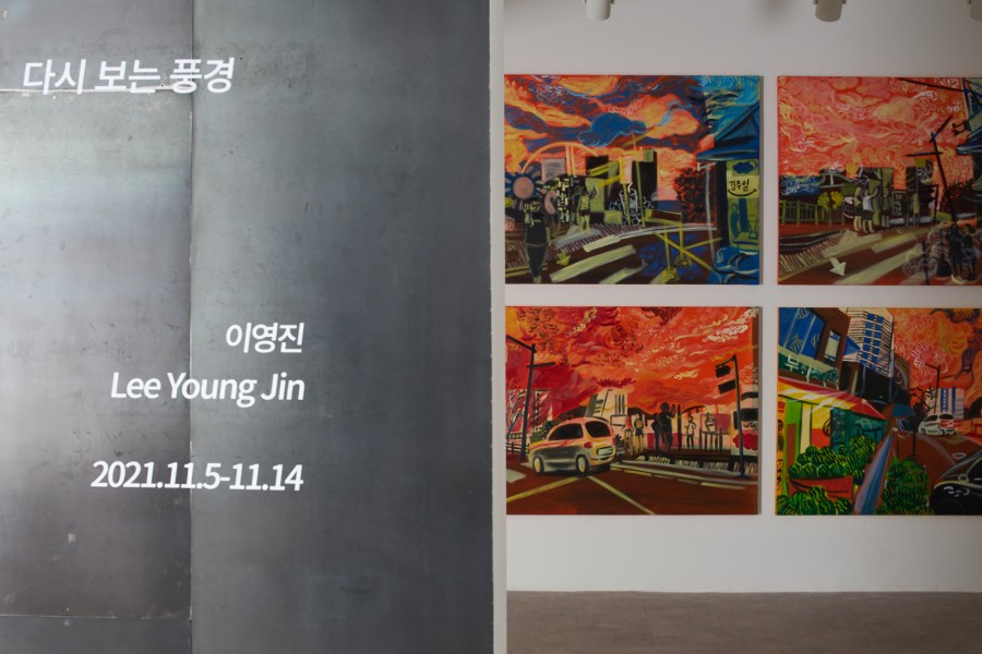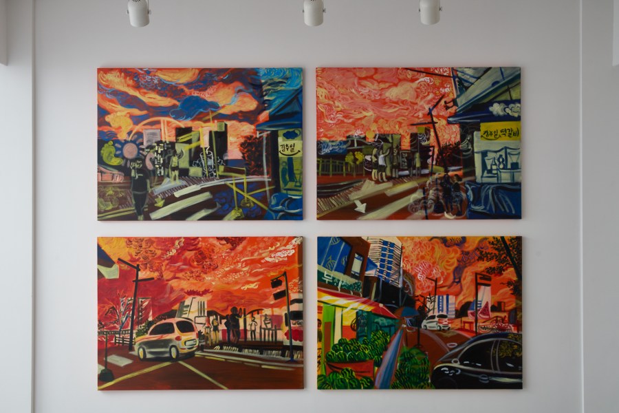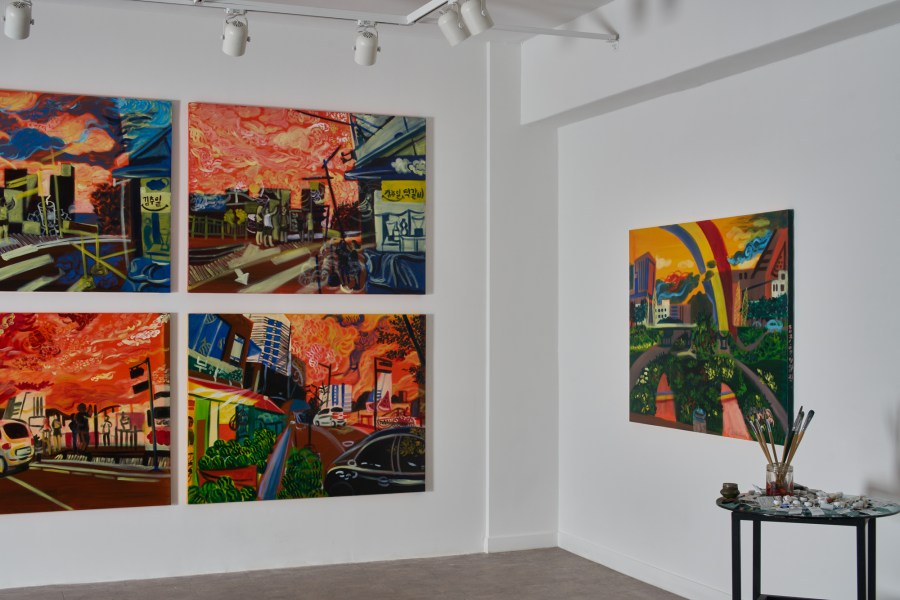 그래서 그려가는 그림 들을 보면 작업실 밖의 풍경들이 대부분이다. 운동하러 조깅을 하러 가는데 하늘을 많이 보는 편이다. 나의 그림 속에서 사람들과 건물이 줄어들고 하늘을 표현하고자 구름을 그리기 시작한다. 버스를 타고 하늘을 보는걸 매우 즐기는 편이다. 하늘을 관찰하다 보면 평소와 다른 풍경이 펼쳐진다. 그것을 나의 그림에 담고 있는데 하나는 노을이고 둘은 무지개이다. 노을은 사람들과 건물 그리고 자동차 모든 것을 붉게 물들이고 두 번 다시 못 볼 것 같은 풍경을 나의 그림 속에 표현하고자 한다. 그리고 지구 밖까지 뚫을 것 같은 얇고 기다란 무지개를 보았다. 내 그림 속에 뚜렷하고 힘있게 표현했으며 길쭉한 무지개를 무게감을 실어 건물을 통과하고 땅을 뚫는 무지개를 아니 풍경을 표현하고자 한다.