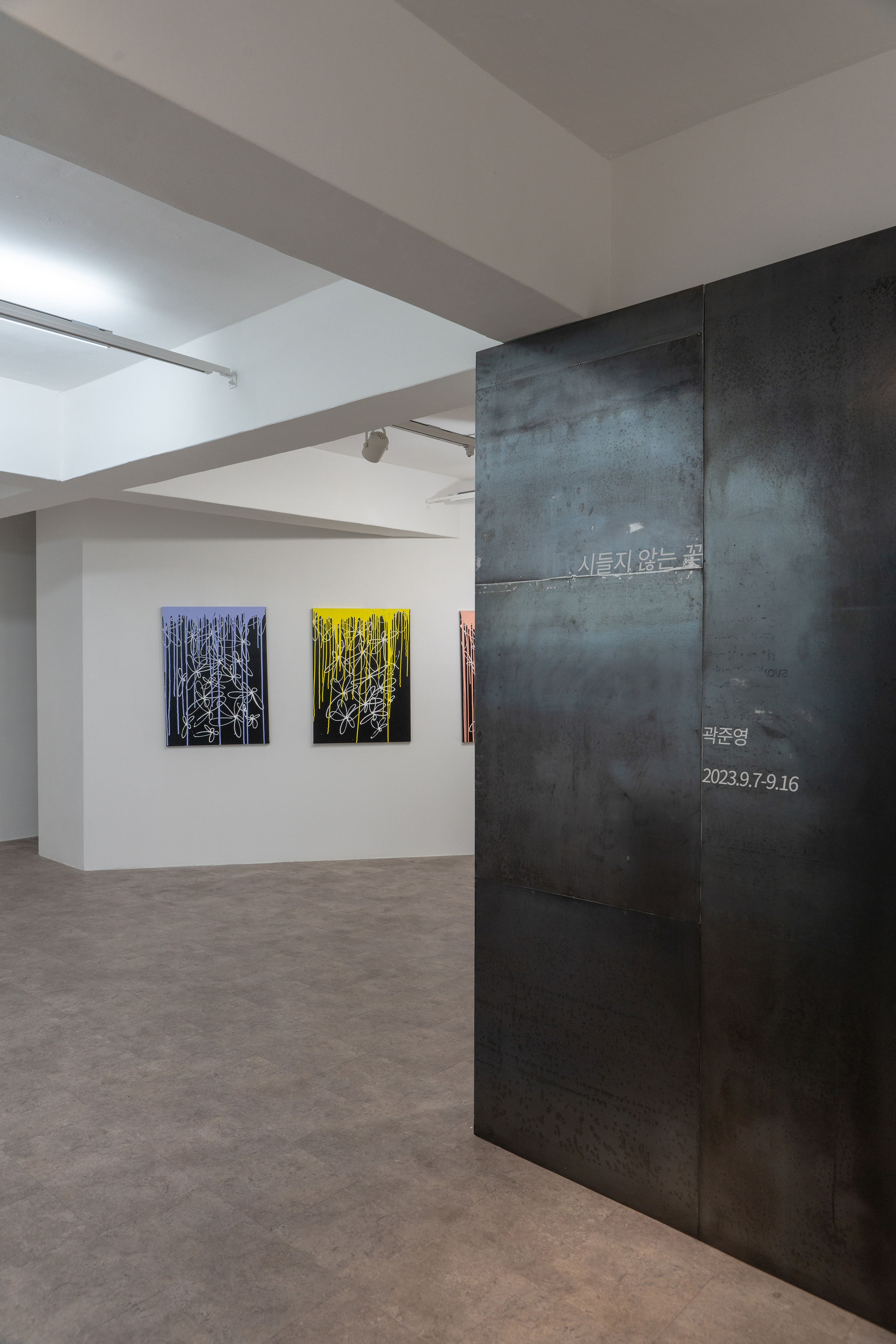 드리핑 기법 안에서는 한 번에 붓질로 작품에 의도성을 만들어낼수도 다시 원점으로 돌아갈 수도 있다. 나에게 있는 인연 또한 같다 나의 한마디, 한 번의 행동으로 그 인연은 변화한다. 나는 빛 과 함께 피어 있을 시들지 않는 꽃을 그리고 선물하고 있다.