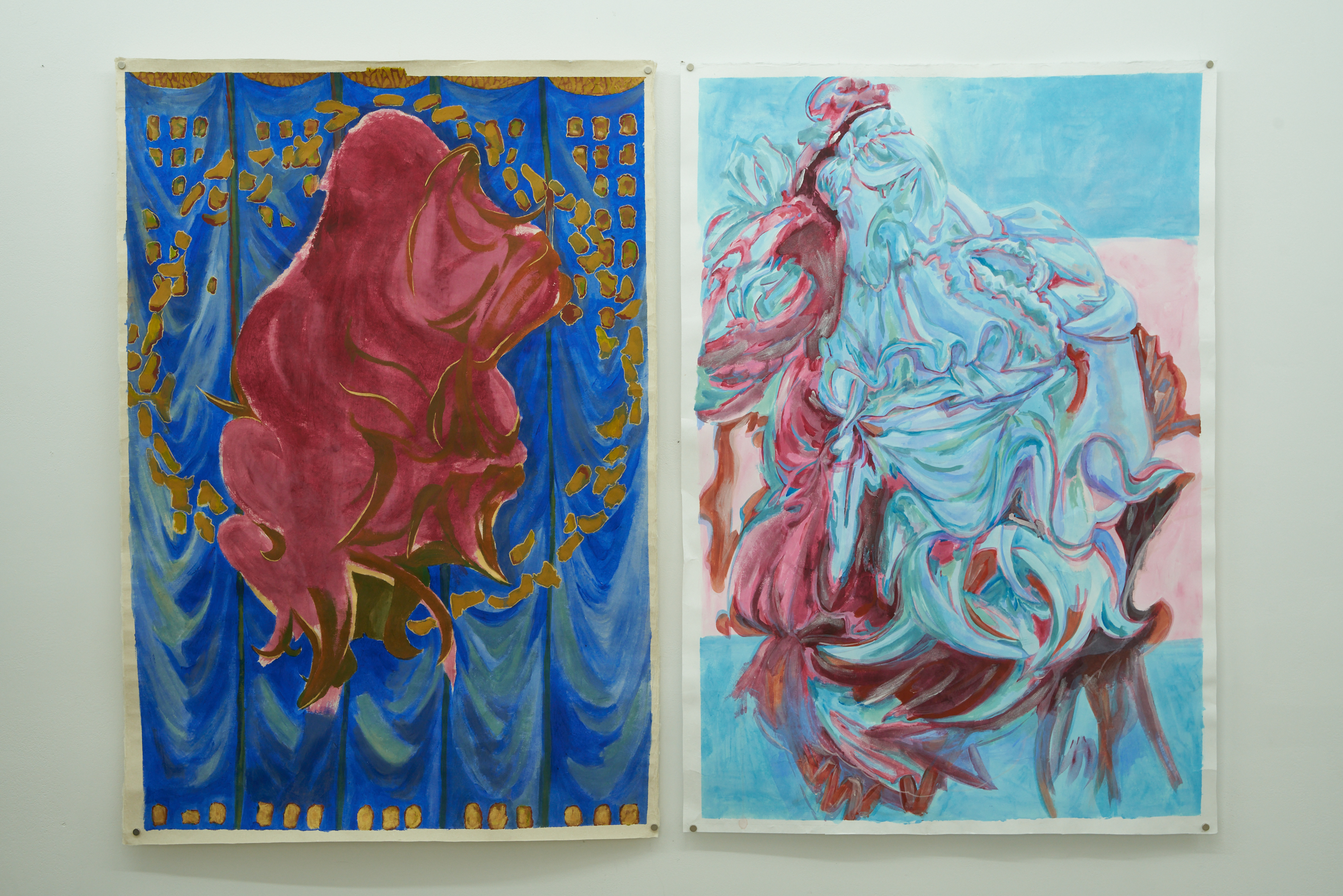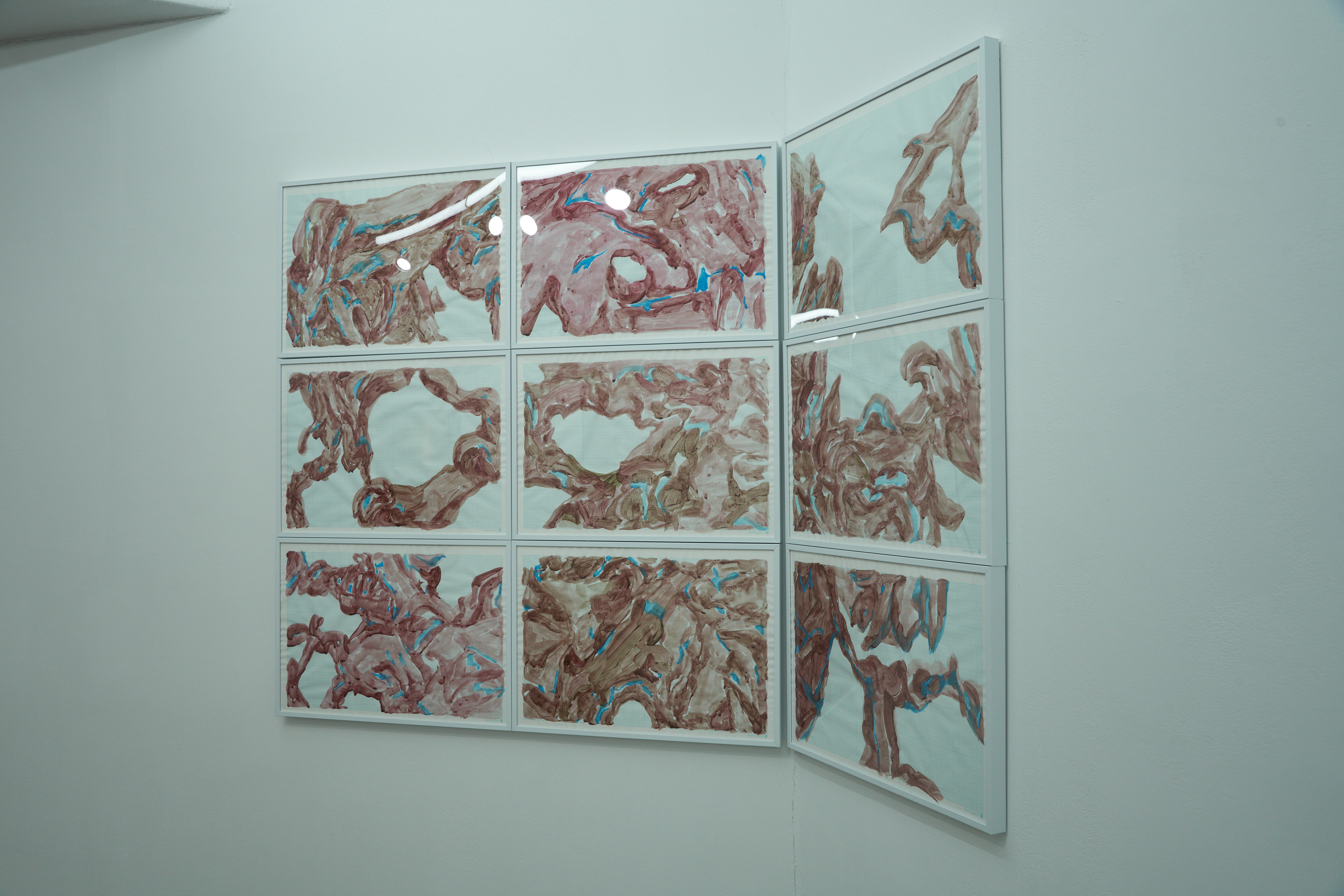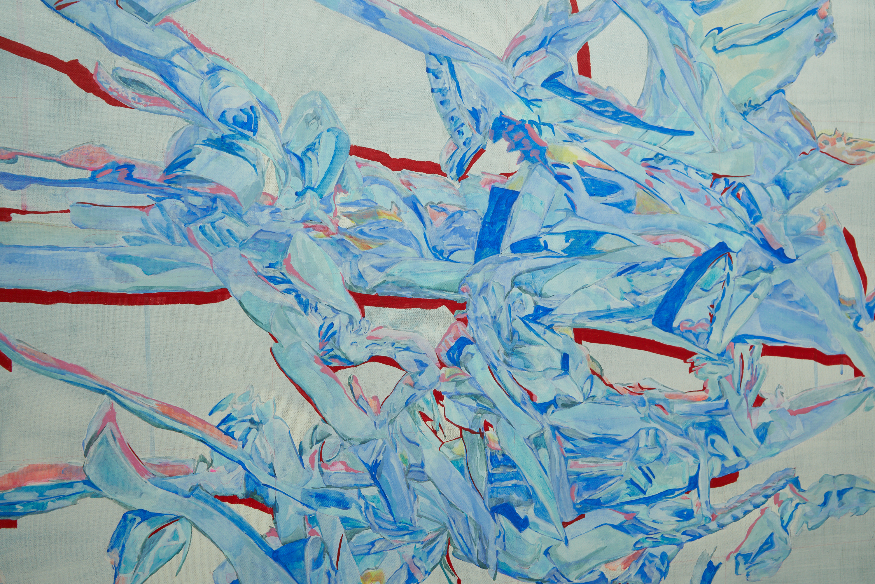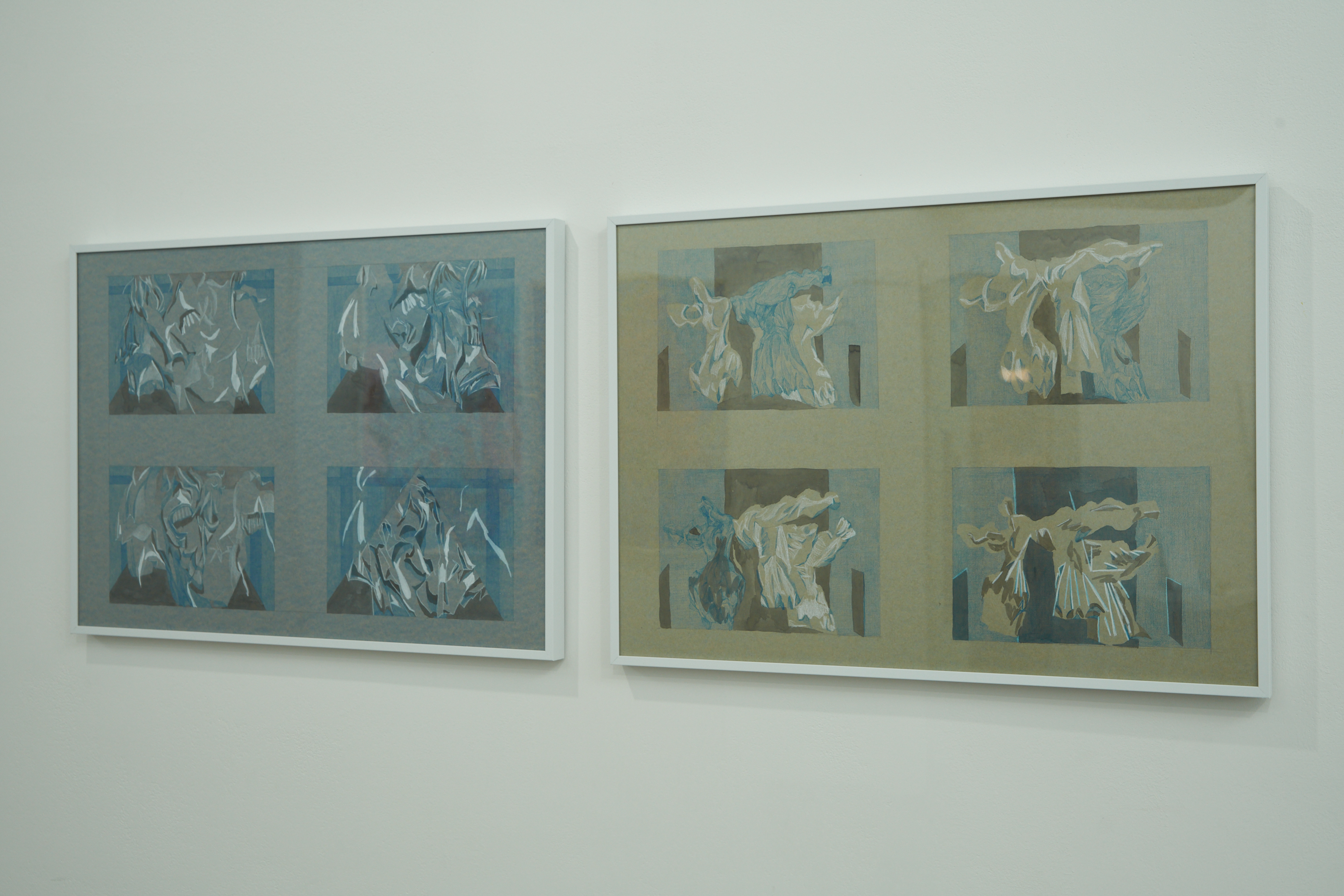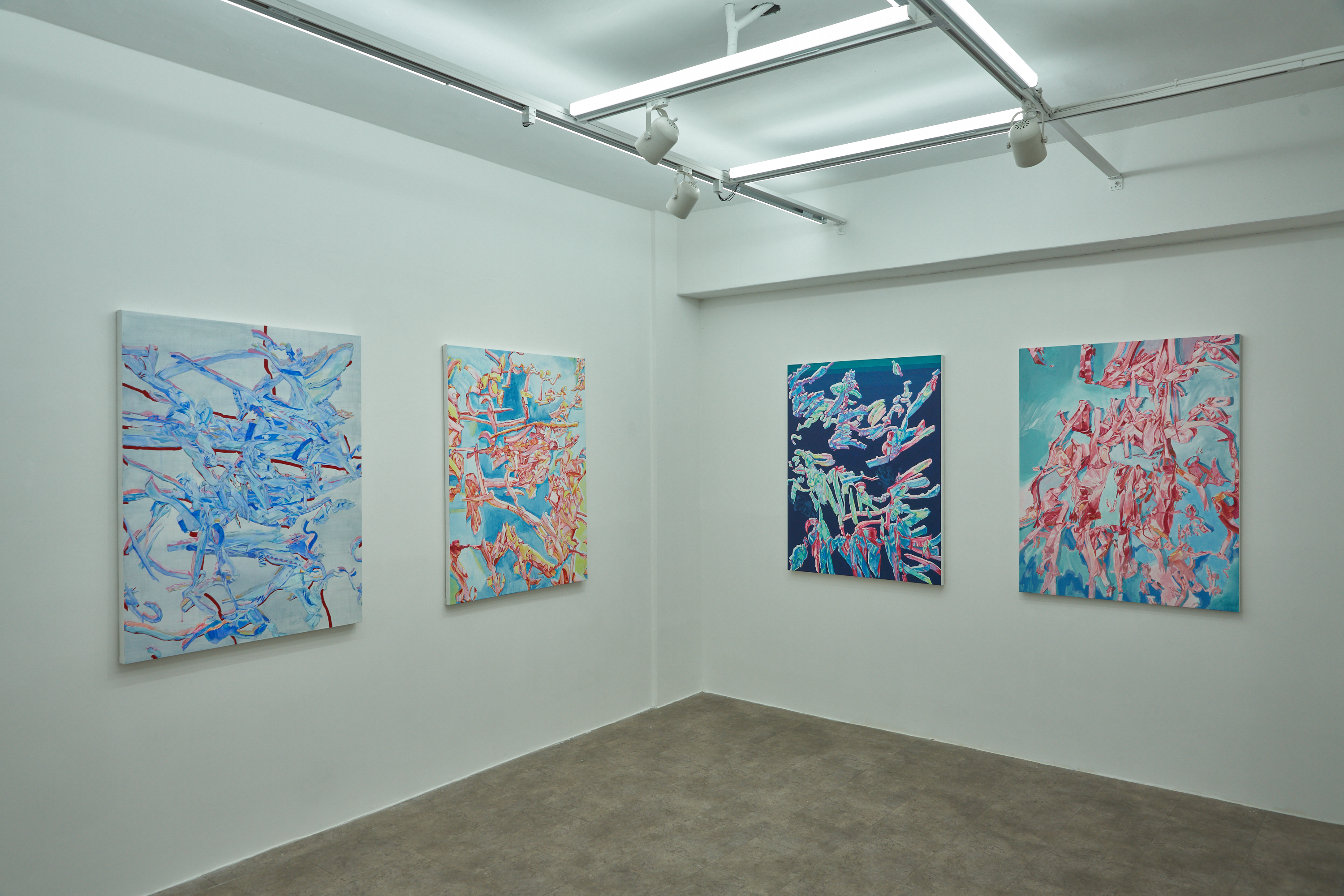 주름은 파편으로 기억에 남는다. 그림에는 아이돌 의상에서 볼 수 있는 퍼프 소매, 리본 장식 등 주름의 조각이 존재한다. 그들은 부풀어 오르고, 하늘하늘 펄럭이며 모양을 쉽게 바꾼다. 특정 주름을 보여주는 것은 한순간이다. 사진 셔터를 누르고, 화면을 캡처해야 한다. 동작을 멈춘 주름은 종이와 캔버스 위에 크림처럼 짜인다. 파편들은 조각조각 해체되었다가 다시 조합되고 뭉쳐진다.