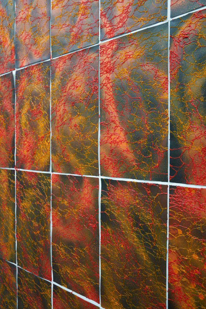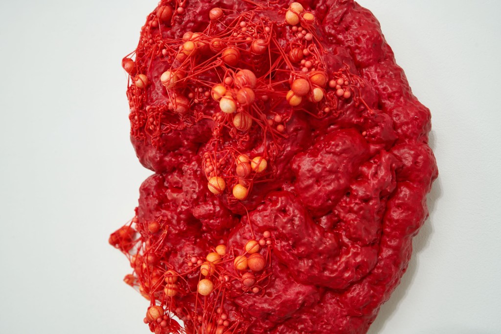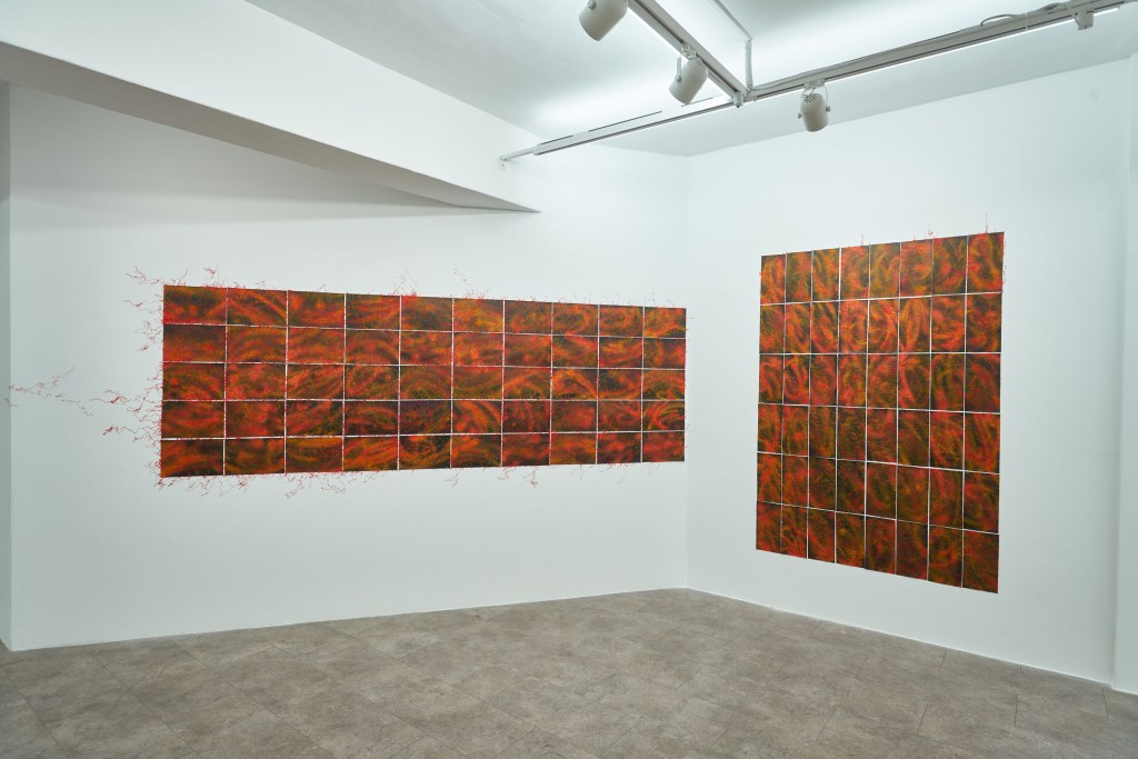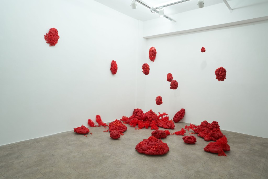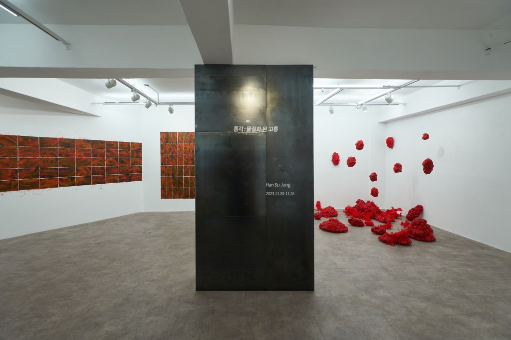 뉴런의 형태와 시냅스의 구조에 영감을 받아 물질화된 고통은 통각의 비정형적 신호형태로 자신을 증강해 나간다. 중심이 없는 풍경은 끊임없이 확장되고 화면은 유기적인 전기신호의 흐름으로 가득 찬다. 3D 프린터로 출력된 이러한 부조적 회화는 화면 밖과도 동기화한다. 3D 프린터로 녹여낸 필라멘트의 선들과 구체형 스티로폼으로 표현된 붉은빛의 입체조형물은 시점을 변화시켜 바라본, 확장되기 직전에 포착되어 고정된 고통이다. 고통 속 각각의 개체는 개인의 사건과 체험으로부터 획득된 독자적인 개체성을 가진 결정들이지만, 통각이라는 매개로 연결되어 군체로 변화하는 순간 새로운 유기체인 군체로 변화한다.